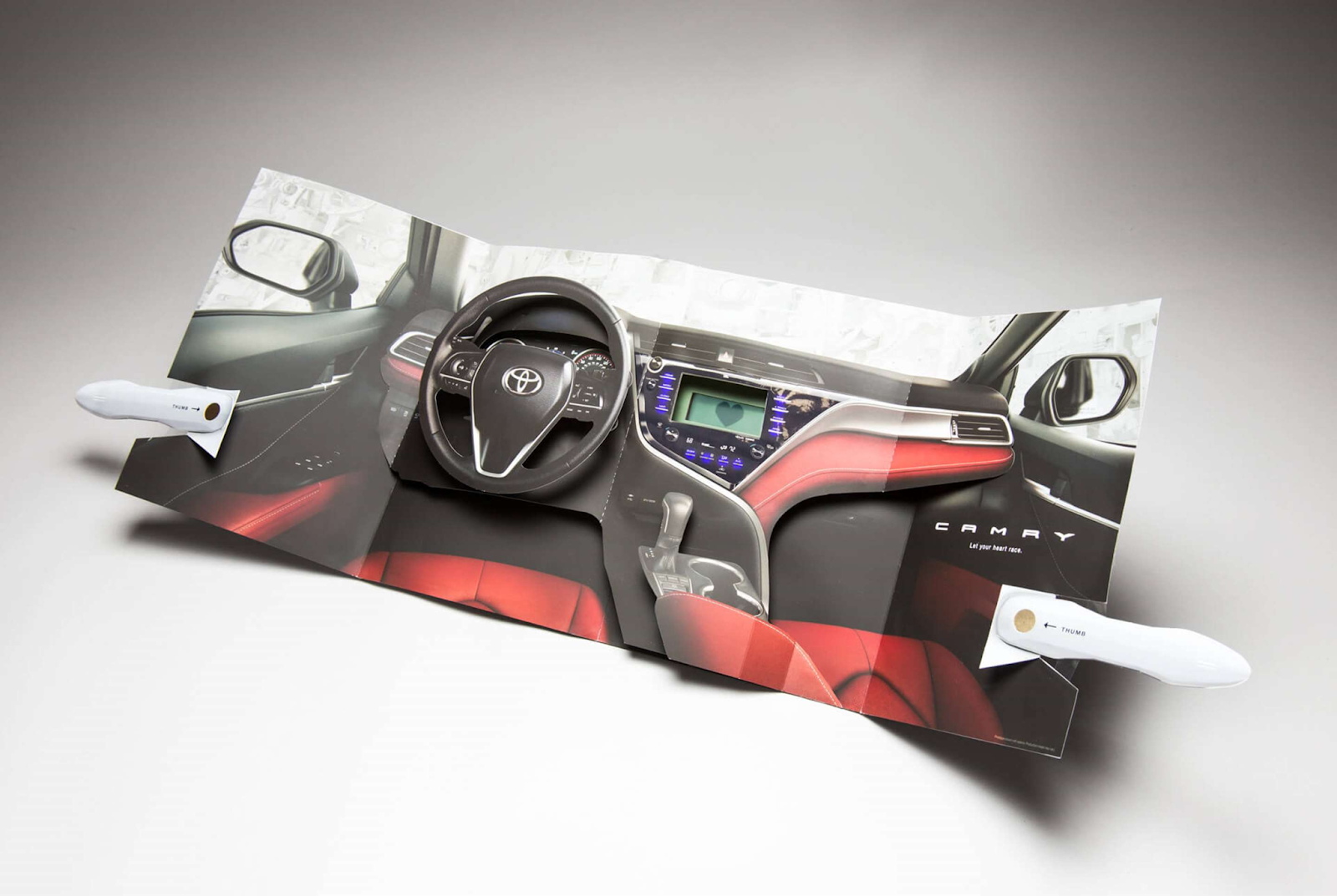 Visual Description: A gatefold advertisement with moving car door handles. The ad opens to reveal a pop-up version of the steering wheel and console of a 2018 Toyota Camry. The 3D effect creates an immersive feeling, as though the viewer were literally behind the wheel for a test drive.