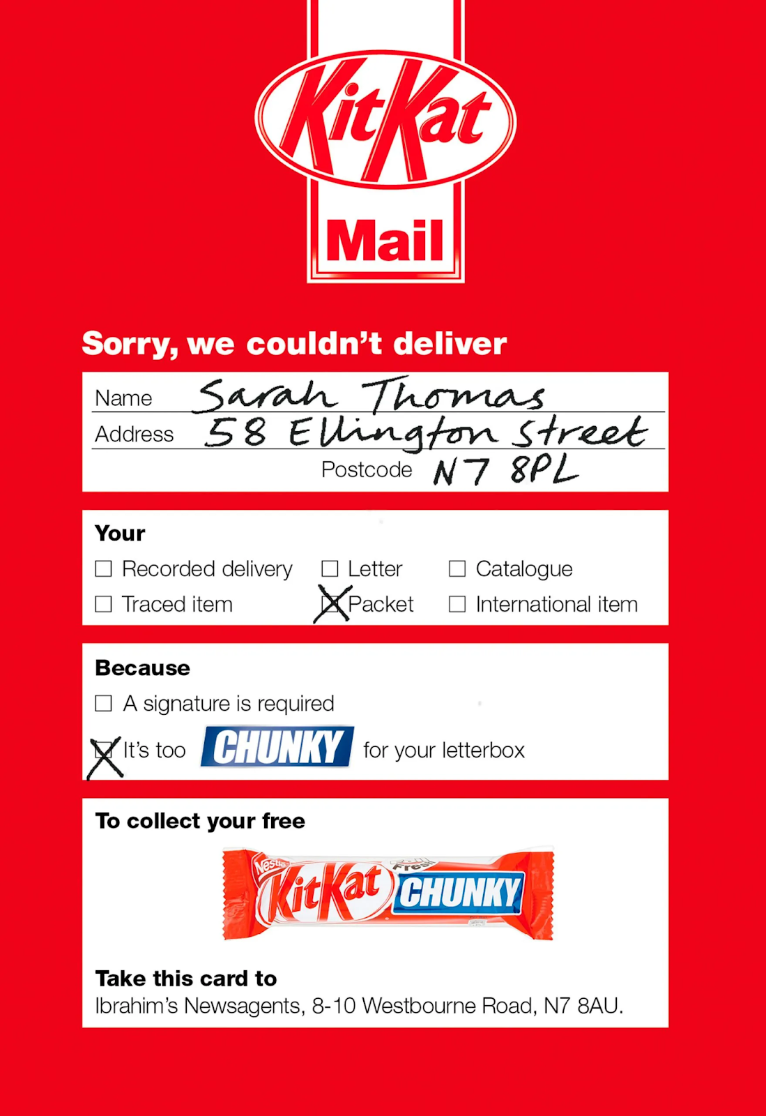Visual Description: An imitation of a failed delivery slip in KitKat’s iconic red and white colors. Under the reason the item couldn’t be delivered, the box is checked for “It’s too CHUNKY for your letterbox”. The recipient is then directed to bring the ad to their local newsagent to collect their missed delivery - a KitKat CHUNKY candybar.