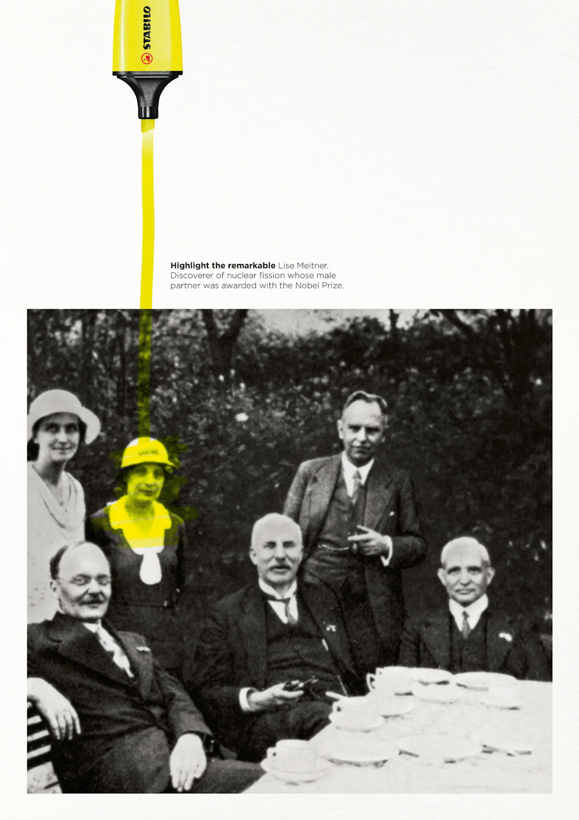 Visual Description: A black and white historic photograph is positioned at the bottom of the page. It features four men in the foreground and two women in the background. One of the women has her face highlighted in yellow. The yellow highlighter line continues off the top of the photo, ending at the tip of a stabilo highlighter that disappears off the top of the page. The copy explains the woman is Lise Meitner, discoverer of nuclear fission, whose work was credited to her male partner at the time.