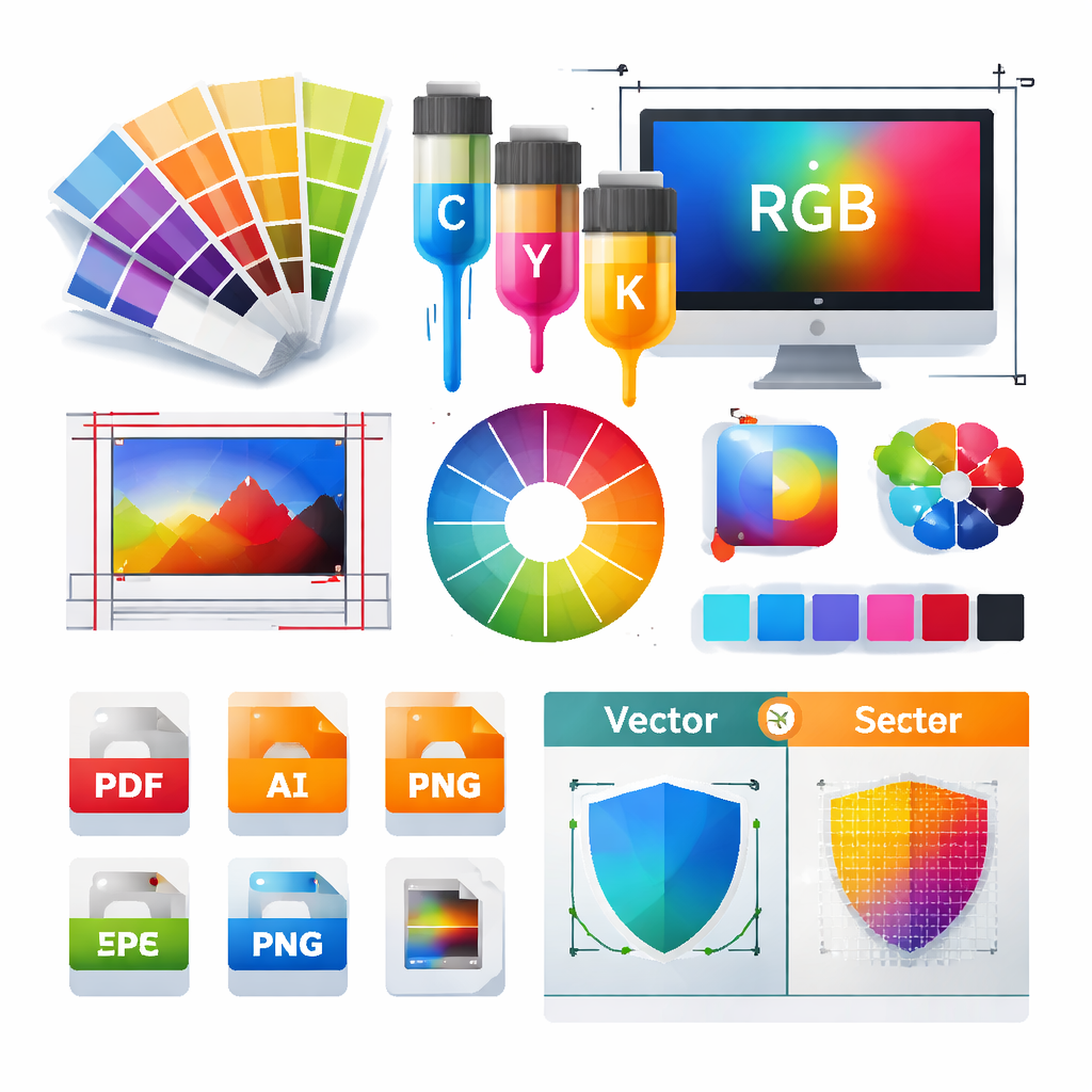 - CMYK: The four-color printing process using Cyan, Magenta, Yellow, and Black inks.