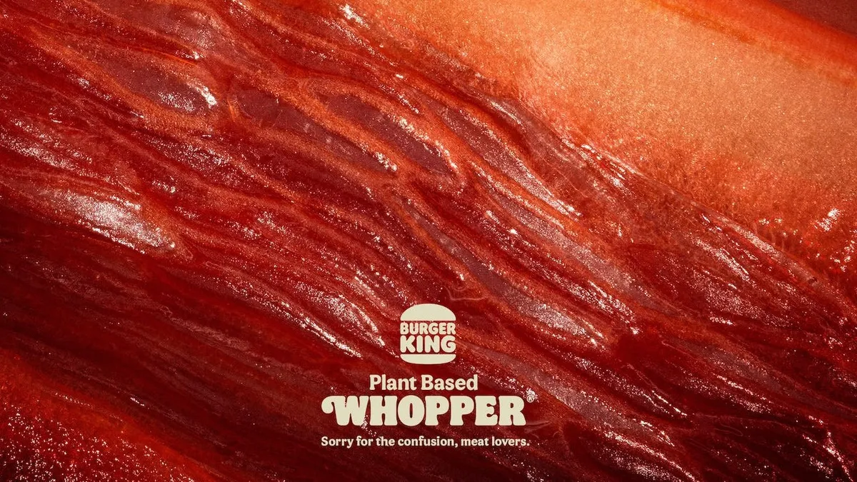 Visual Description: An extreme closeup shot of an unidentified, highly-textured, reddish-brown organic material. It looks similar to bacon. However, a tagline in small print at the bottom of the ad reads “Plant Based Whopper - Sorry for the confusion, meat lovers.”, implying the photographed material is actually some sort of fruit or vegetable.
