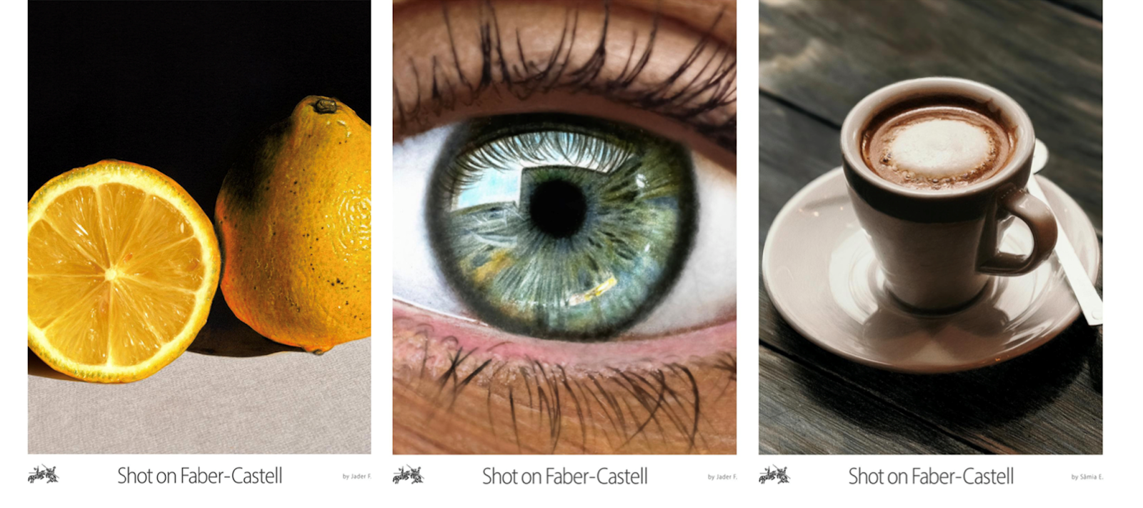 Visual Description: A series of posters featuring photo-realistic colored pencil drawings of lemons, a human eye, and a mug of coffee. All three posters feature the Faber-Castell logo on the bottom left on a white background, beside the centered tagline “Shot on Faber-Castell”.