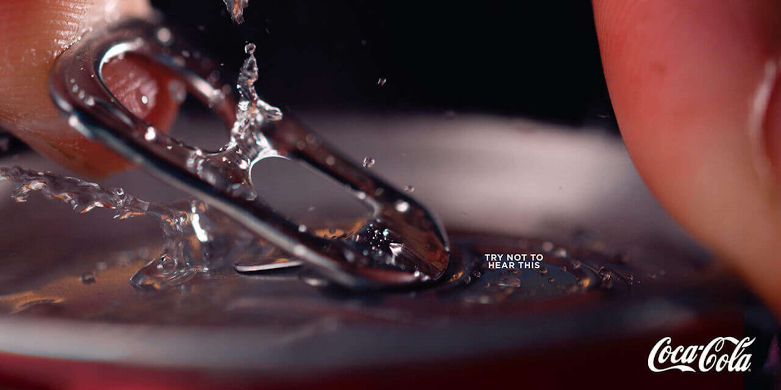 Visual Description: An extreme close up on the top of a can of Coke. The metal tab is being lifted up by a finger tip, while another finger tip is pressed down against the rim of the can. There’s a spray of water flinging off droplets beneath the lifted tab, and a few droplets of soda emerging from the perforated edges of the hole in the top of the can. The tagline “Try not to hear this” is written in fine print to the right of the tab.